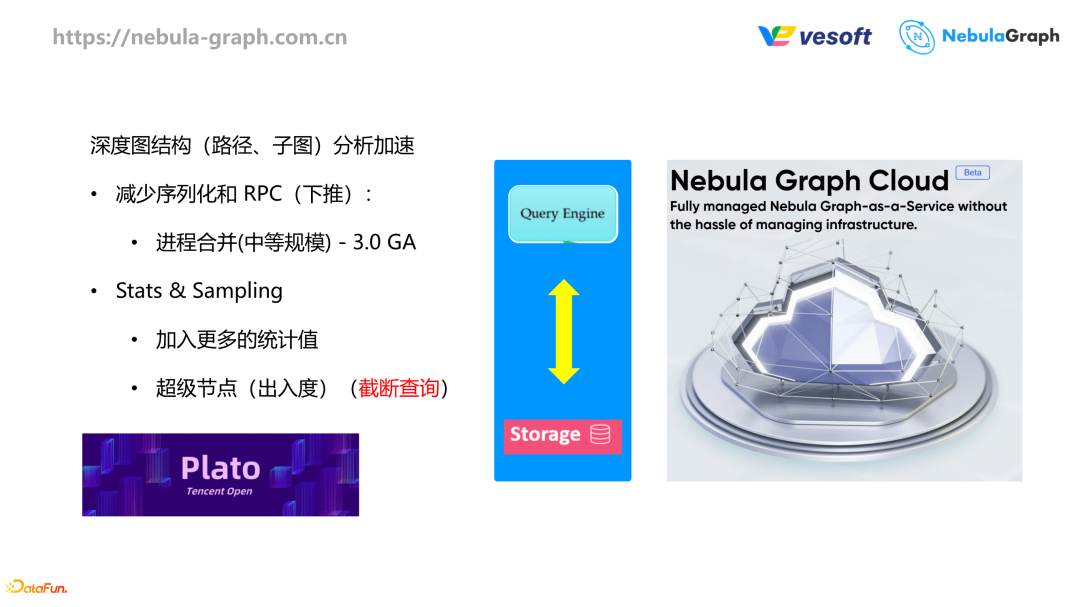 比如说减少序列化和 RPC,RPC 可以用下推的方式,但也可以用其他方式,比如进程合并的方式,把计算引擎和存储引擎尽量合并在一个进程里面,减少两者之间一次 RPC 涉及的大数据量的“序列化——传输——反序列化”过程,这个过程对于一次中等数据规模的传输来说占了其中的大部分资源。存储计算合并版本 Nebula Graph 已经进入 3.0 的主干版本了,当然这还有一个目的是为了在云服务上面使用。