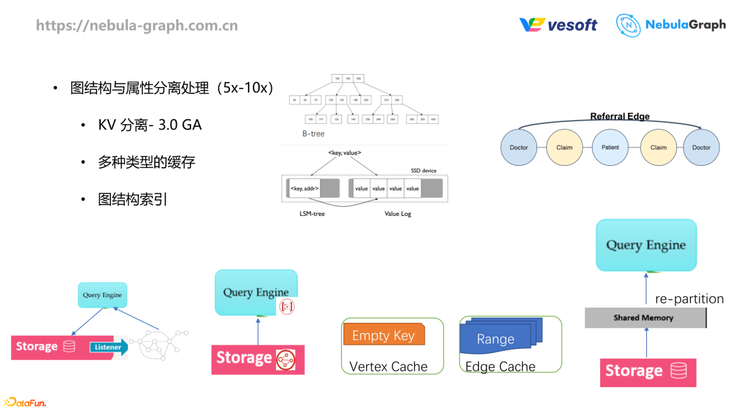 除了 KV 分离,Nebula Graph 也尝试过非常多类型的缓存。比如通过一个 Listener 把整个存储的图结构放到另外一个Storage进程上,这个进程只放图结构;或者是把图结构缓存在计算引擎,缓存方式可能不是邻接表,也可能用矩阵形式;或者是把存储的图结构中点和边的 cache 另外设计。