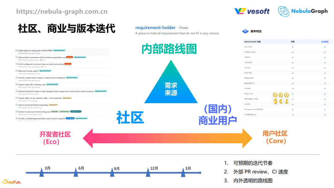 先说需求。需求有三个方面的来源,一方面是社区,一方面来自于商业用户,特别是国内的商业用户,第三方面来源于内部的路线图。不管是社区,还是商业用户,都不一定非常关注产品长期往哪里走,所以内部还是要有一些长期目标。这三个方面的需求要有权衡。
