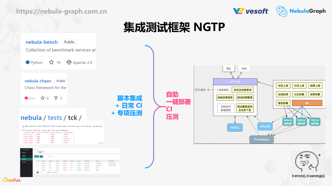Nebula原来有一些测试工具,nebula-bench和nebula-chaos,是关于各种功能和性能测试的。但不管是外部的开发者贡献PR时想做点回归,还是内部想做点回归或点压测,都非常麻烦,因为它是一个脚本集成,还要投入人力做专项的压测。