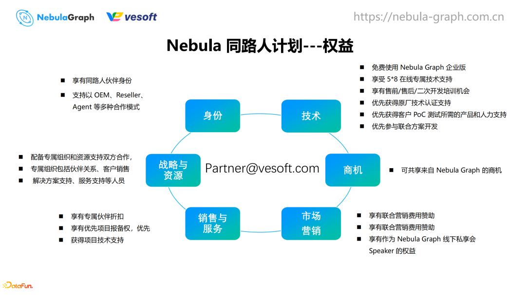 有兴趣的伙伴可以往 Partner@vesoft.com 发邮件,或者联系我个人,我会转给我们对应的同事。希望大家能够在这些方面能够达成更紧密的合作。