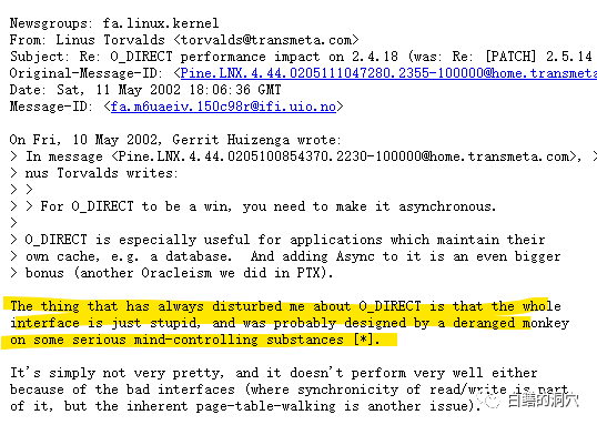 数据库系统是不是能够从DIRECT IO上受益的争论实际上已经持续了二十多年了,不过现在还有一些人认为DIRECT IO对数据库系统不一定有效。今天就遇到一位这样的朋友和我讨论这个问题,用来佐证他的观点来自于一位大佬-Linus Torvalds 。