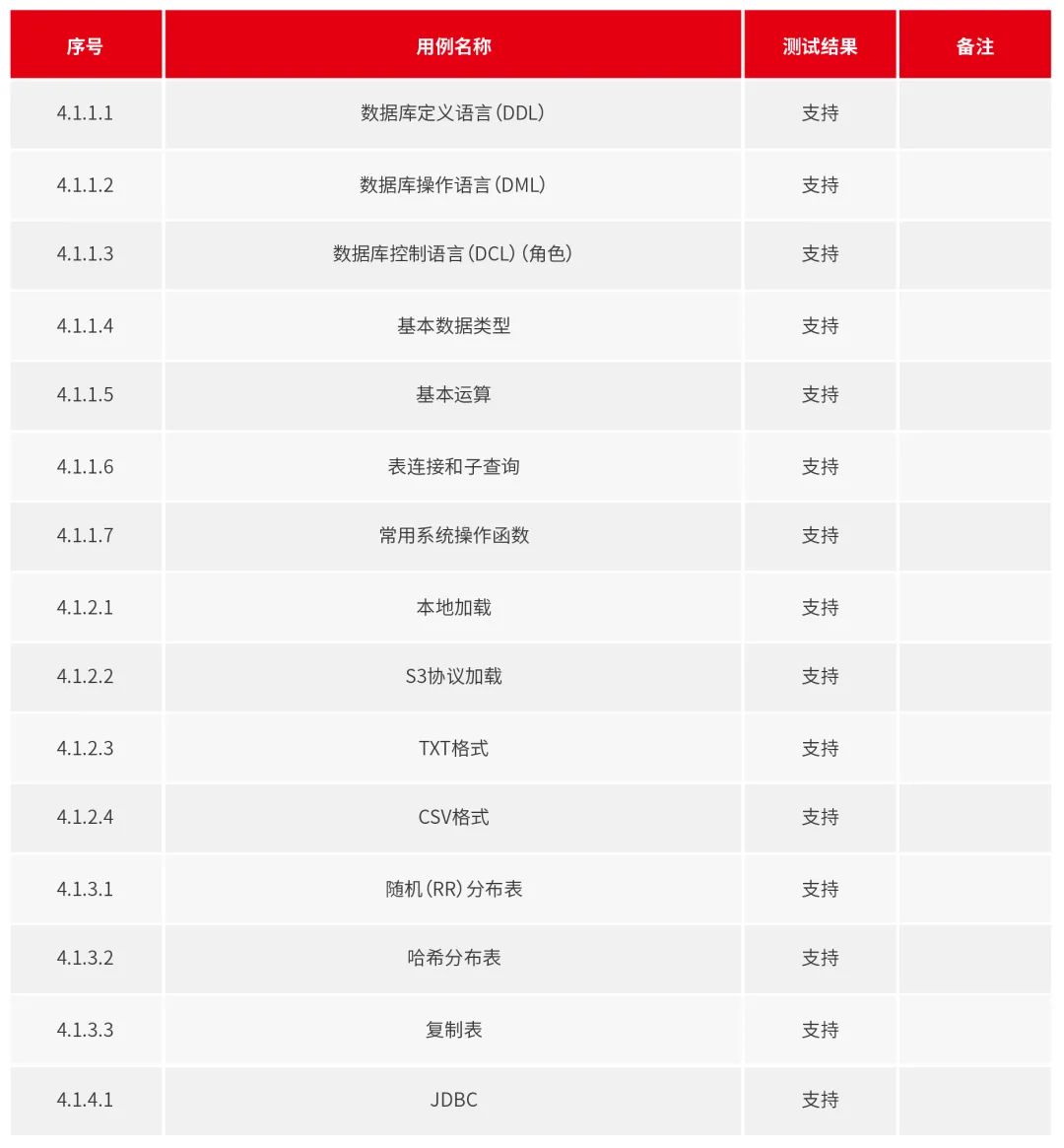 功能测试:涵盖标准SQL、数据加载、表数据存储分布方式、开发接口4个方面,共15个测试小项,所有功能测试项完全支持,全部通过,具体测试结果,详细如下所示: