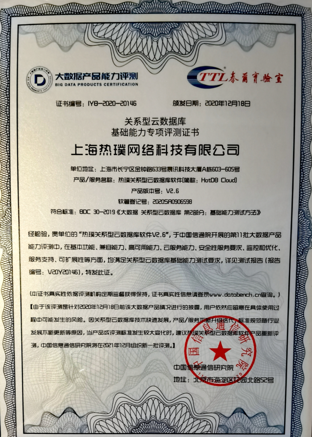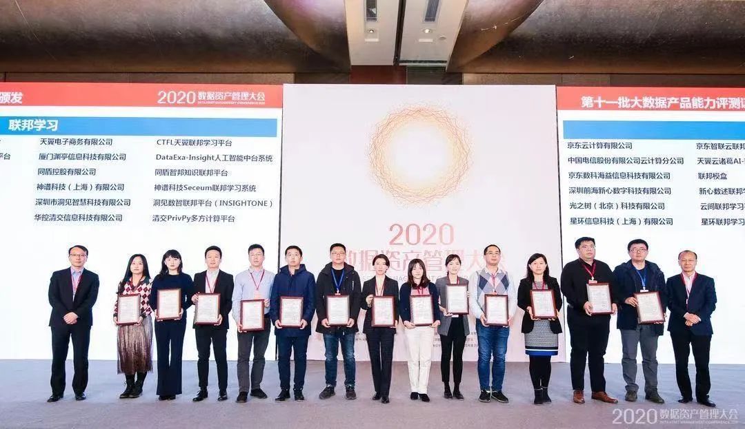 2020年12月18日,由中国信息通信研究院(以下简称“中国信通院)”、中国通信标准化协会主办的“2020数据资产管理大会”在北京召开。会上,中国信通院为通过第十一批大数据产品能力测评的企业发布权威证书。