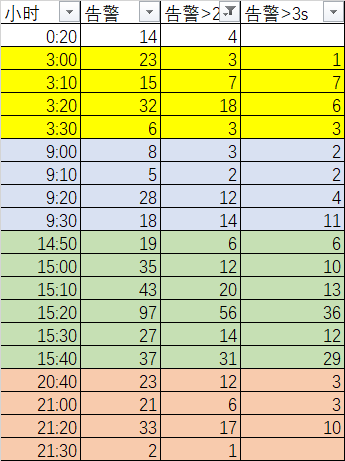 awk '/Two consecutive receivecalls took/{t=substr($2,1,5);wait=$(NF-2)/1000;if( wait>=3;cnt3[t]++);if( wait>=2;cnt2[t]++);if( wait>=1;cnt1[t]++);}END{for (i in cnt1)print i,cnt1[i],cnt2[i],cnt3[i]}'*lms*.trc