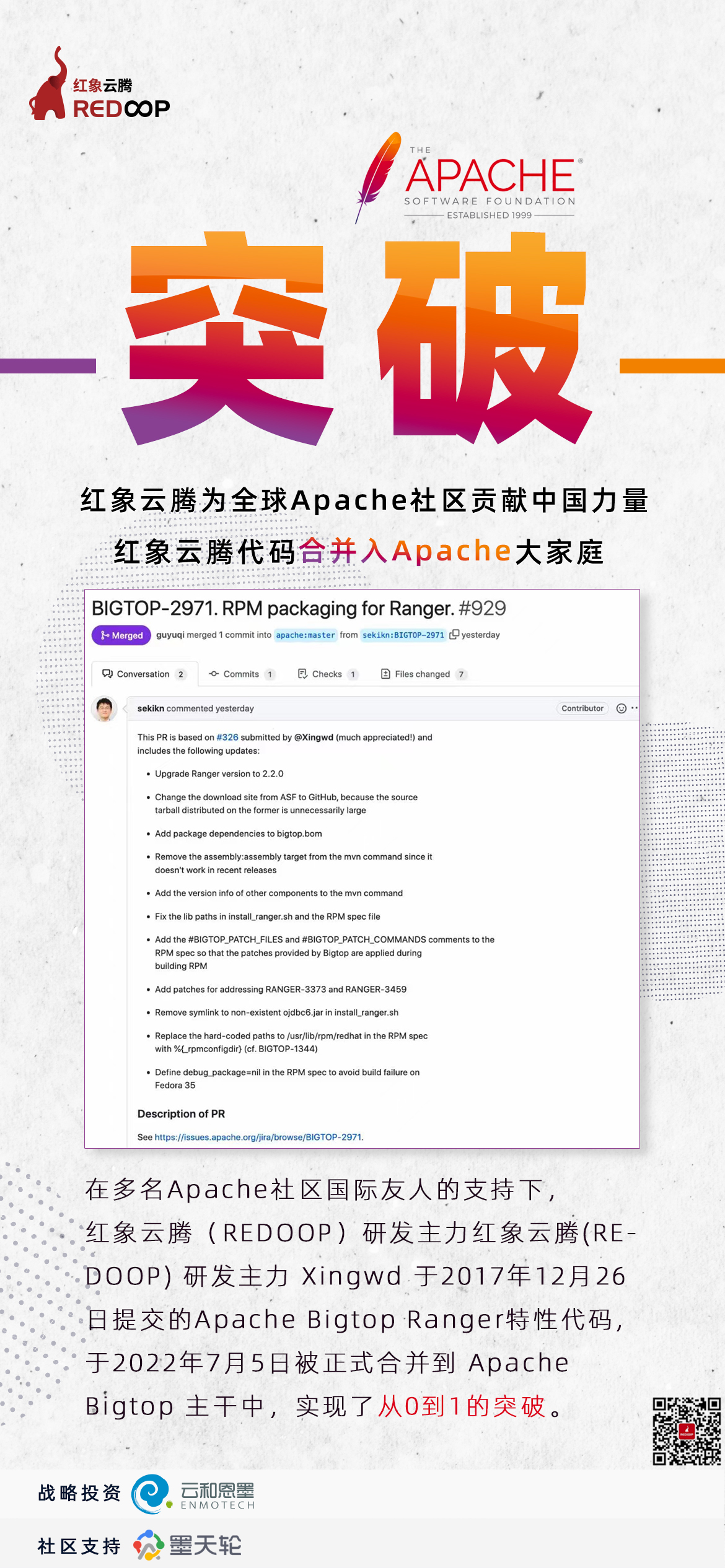 在多名Apache社区国际友人的支持下,红象云腾(REDOOP)研发主力红象云腾(REDOOP) 研发主力 Xingwd 于2017年12月26日提交的Apache Bigtop Ranger特性代码,于2022年7月5日被正式合并到 Apache Bigtop 主干中,实现了从0到1的突破。