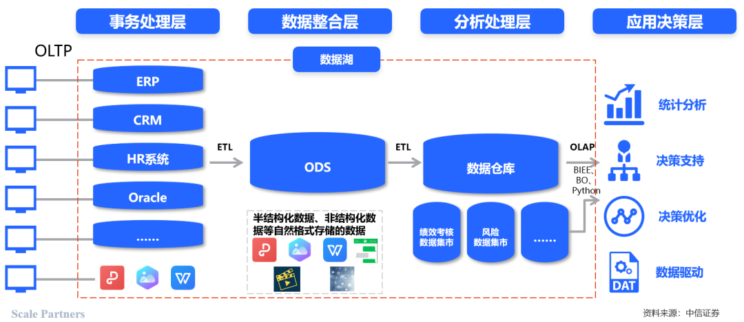 (4)数据仓库:是处理过后的结构化或者半结构化数据,更加靠近数据的消费端。