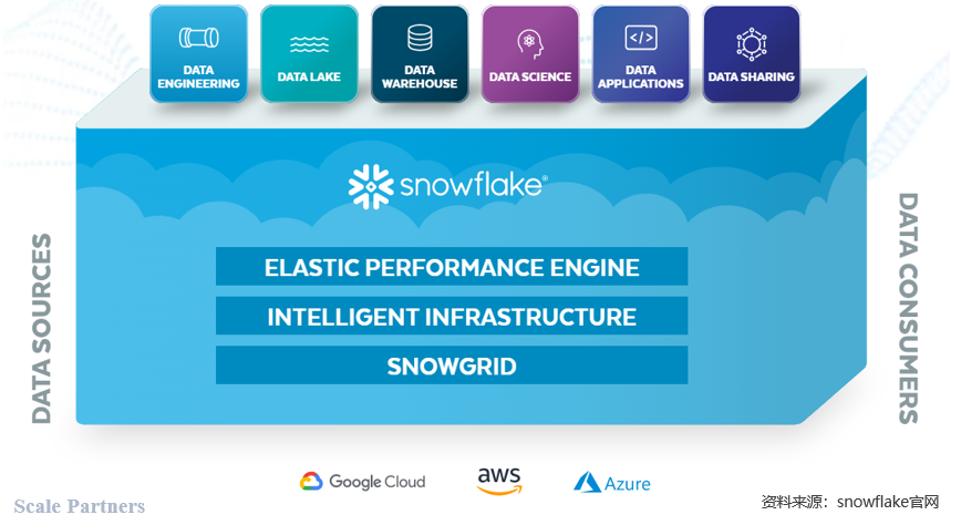 云原生架构,研发周期长,产品功能完备。1.帮助企业实现了数仓按需上云,其数仓的底层可对接AWS、谷歌云等主流云计算平台供客户选择,其提供的多云间迁移、多云上容灾备份等服务较为吸引用户;2.Snowflake CDW可以兼容多家公有云厂商,这一技术创新从根本上解决了传统数据仓库的架构问题,最大化体现了云原生的架构特点;3.实现了存储与计算分离,在资源管理上更为精细化。Snowflake 开发的CDW支持计算、存储节点单独扩展,实现在查询计算时,不影响同步扩容或缩容,不发生延迟或中断;4.Snowflake自身联合了数家专注于机器学习的厂商来去打造自己的data cloud。
