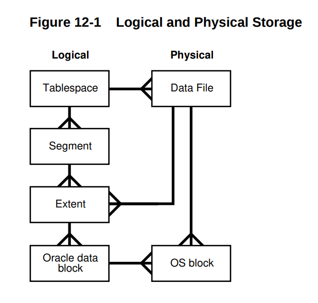 这是《Concept》中关于逻辑和物理存储结构的一张经典图,数据块是最小的I/O存储和处理单元,逻辑结构中,从数据块(Block)往上,就是区(Extent)、段(Segment)和表空间(Tablespace)。物理结构中,操作系统块,可以说起到了衔接的作用,一个Oracle数据块(例如8k)可以包含多个OS块(例如2k),一个数据文件则包含了多个OS块。同样起到衔接作用的,还有表空间,一个表空间可以包含多个数据文件。通过这种设计,达到了Oracle数据库存储数据的目的和保障。