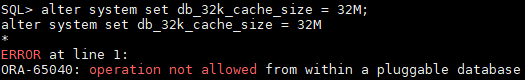如文章所说,Oracle默认数据块是8k,在数据库创建时指定的,如果此时要创建一个非标准数据块的表空间,需要设置db_nk_cache_size参数,如果是19c以上的CDB数据库,该参数需要在CDB中进行改动,PDB中改动,会提示错误,如下所示,