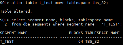 将其移动至32k数据块的表空间,占据的数据块个数是64,同一个数据块中存储的数据多了,需要的数据块个数就少了,