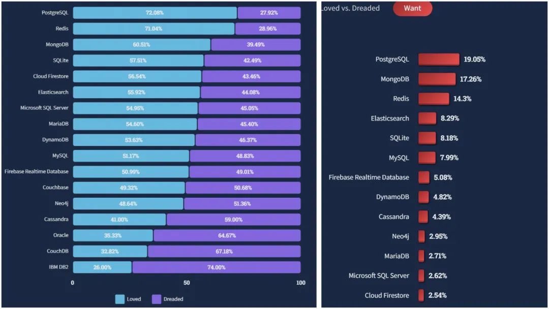 根据Stack Overflow 2022 开发者调查报告显示,PostgreSQL已经超越MySQL成为开发者最喜爱的数据库软件。