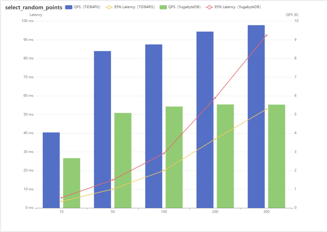 | 线程数 | QPS(TiDB4PG) | 95% Latency(TiDB4PG) | QPS(YugabyteDB) | 95% Latency(YugabyteDB) |
