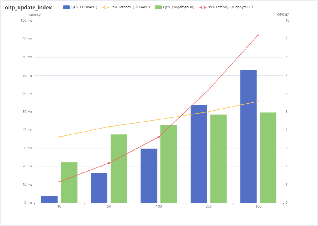 update_index是根据主键更新索引列,在这一场景中YugabyteDB在小并发量时性能更好,但是随着并发量上升会更快达到性能瓶颈,并且会越来越差,TiDB For PostgreSQL相对稳定。