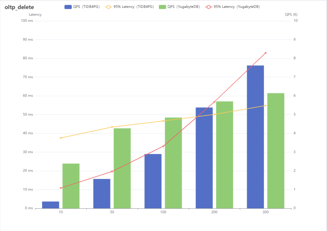 delete场景是根据主键删除一行记录,这个测试结果类似非索引更新,刚开始YugabyteDB性能较好,并发量上升以后慢慢落后于TiDB For PostgreSQL。