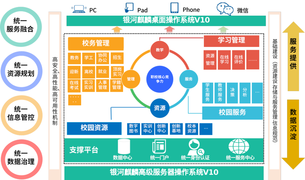 党中央、国务院高度重视职业教育改革发展工作,2021年4月,中央召开全国职业教育大会,会议传达学习了习近平总书记和李克强总理的重要指示批示精神,对职业教育改革发展作了总体部署。2021年7月31日中共中央办公厅、国务院办公厅印发《关于推动现代职业教育高质量发展的意见》。信息化作为职业教育高质量发展的强劲动力,麒麟软件携手联合永道深入了解行业趋势,契合《智慧校园总体框架》的标准要求,围绕职业院校“校园管理、教学环境、教学资源、校园服务”4大核心,结合专门针对中高职院校信息化建设需求的全套智慧校园产品,打造基于银河麒麟操作系统的职业教育智慧校园联合解决方案,构建更安全、更有效、更稳定的整体智慧校园教学管理系统,帮助职业院校创新教学育人模式,提升校园管理水平,构建“互联网+智慧校园”新生态。