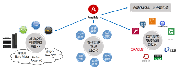 其中,Ansible作为开源社区能够实现整个云平台自动化部署和运维的主流软件,堪称实现IT自动化运维最简便的方法,浪潮K1 Power支持的所有操作系统均可完美安装Ansible组件,结合其自动化能力,能够大幅降低包括系统运维人员和开发人员在内的整个IT团队的运维负担,有效降低运维风险。浪潮K1 Power通过Ansible软件可以实现以下主要自动化运维场景: