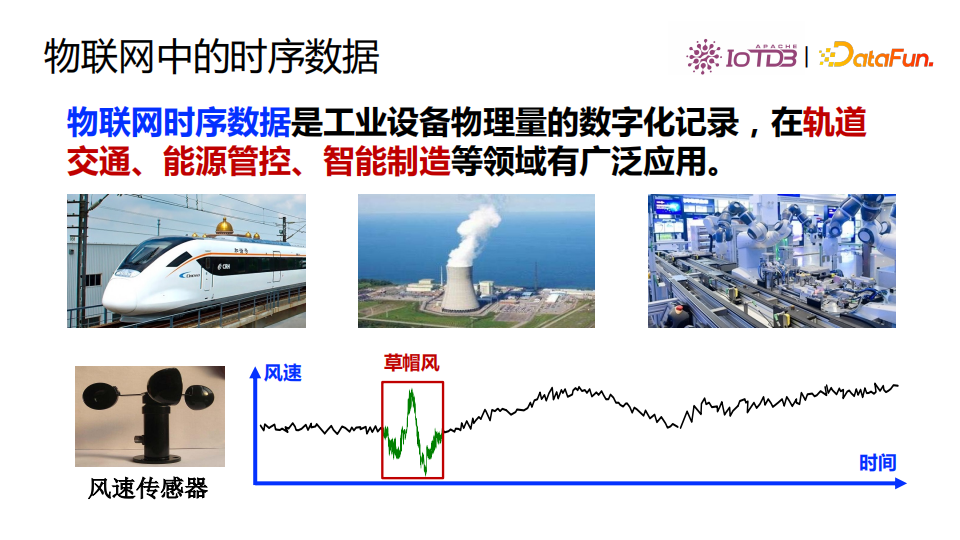 IoT是物联网的缩写,DB是数据库的缩写,IoTDB的名字直接说明了它物联网数据库的定位。物联网场景下时序数据主要来自传感器的采集,如风力发电机上用于探测风速的传感器,每秒采集一条数据,随着时间推移,这些数据就会形成时间序列,时间序列数据就反映了当时风力的变化情况。图中的绿色部分展示了草帽风的现象。由于形状类似草帽因此称之为草帽风,此类风会对风机叶片产生负面影响,进而降低风机寿命。