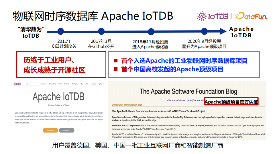 接触工业物联网用户、为用户管理时序数据,是清华大学软件学院在2011年开始的一个方向。随着我们对产业和时序数据相关的研究与思考的深入,我们开始自研时序数据库,在2017年推出了IoTDB第一个版本并在Github公开源码。2018年我们将项目捐赠给Apache基金会。经过两年的摸索,IoTDB在2020年9月成为了Apache顶级项目。至此,IoTDB是首个入选Apache的工业物联网时序数据库项目,也是首个中国高校发起的Apache顶级项目。IoTDB被来自德国、美国、中国的工业互联网厂商和智能制造厂商使用和打磨,产品和功能在开源社区中不断成熟。