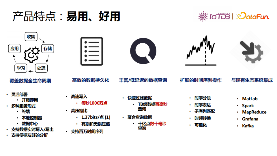 IoTDB产品易用、好用,部署灵活,能开箱即用一键部署,具有高写入吞吐和低查询延迟,支持丰富的时间序列操作,与现有大数据生态系统集成比较完善。