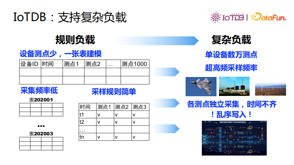 复杂负载单体设备可能会产生上千甚至数万的点,如飞机采样频率比较高,转动传感器每秒钟采集几十甚至几百个数据点,或者人工去分表都难以满足需求。但IoTDB会针对这些复杂负载进行优化。
