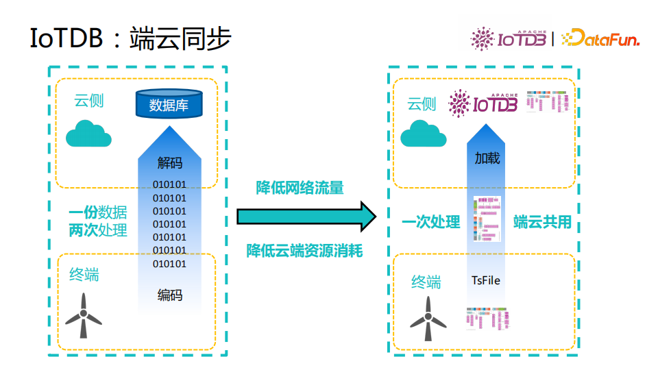 IoTDB支持端云同步。端云同步是物联网领域中常见的场景。终端设备采集数据,一条条地发送数据到云端数据库。该过程中需要在端侧对数据编码为二进制流,在云数据库侧解码数据后写入数据库。终端数据大量增长时,存在云端压力不断增加,网络带宽消耗大的现象。