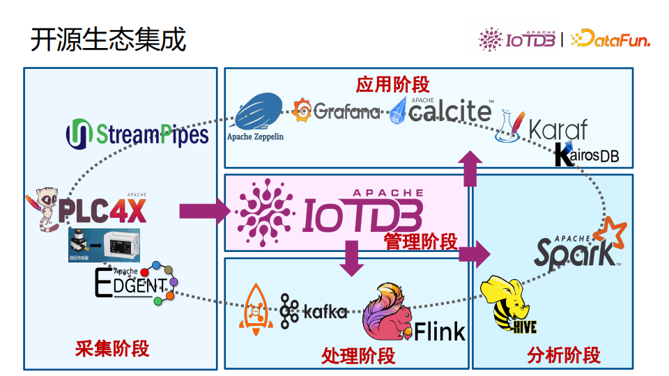 IoTDB专注于数据的存储管理,为了支持更多对数据的全生命周期处理,我们与众多开源项目进行了集成。IoTDB支持PLC4X等工业采集协议,也适配了Kafka、Flink、Spark,还对数据交互软件和可视化工具做了支持如Grafana, zeppelin等。用户可以自由地利用开源软件满足自己的数据采集、处理、分析的需求。