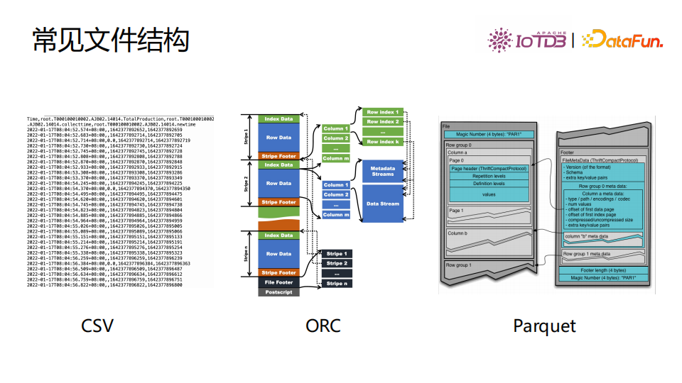 Spark、Hive、Presto广泛使用了CSV、ORC、Parquet这些文件结构。ORC和Parquet是支持嵌套的列式存储文件结构。当使用这些文件结构存储数据时也需要进行建模,包括定义每列的数据类型和名称等。