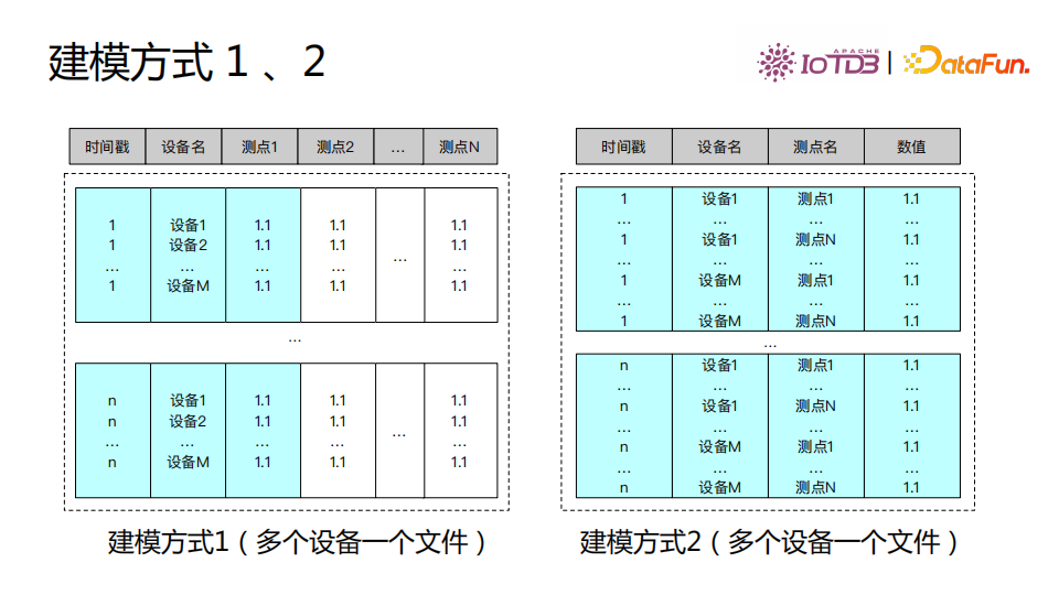 一种建模方式是把所有设备数据都存到一个文件里面,此时文件中表结构第一列是时间戳,第二列是设备名,后面是这个设备的所有的测点数据。可以看到这种建模方式下,一个文件可以管理多个设备的数据,但设备名字是被重复存储的。当查询一个设备的一个测点的时间序列时,下图中建模方式1的蓝色部分需要全部读出来进行过滤后才能得到结果。