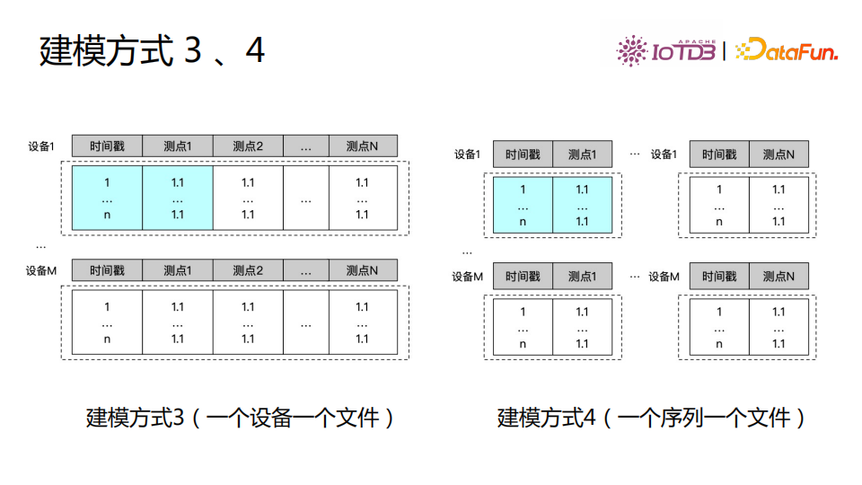 图中左侧是一个车辆有两个传感器,这两个传感器采集的时间是不对齐的,这时我们叫它非对齐的序列。那这种建模方式会把每一个时间序列里都存一列时间,这种方式是最节省空间的,没有存储任何空值。这种方式适合一个设备的不同传感器是独立采集的场景。