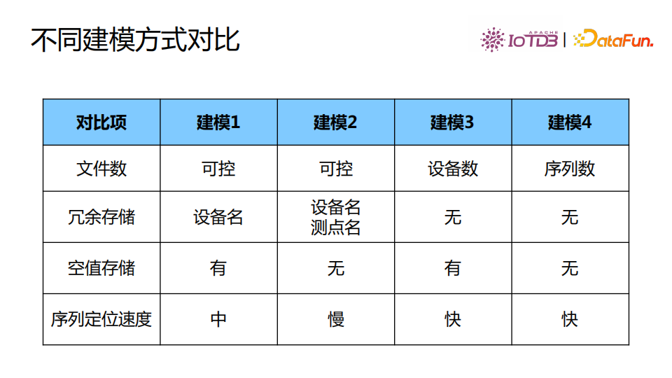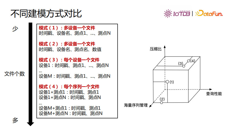几种建模方式从文件数的角度,建模方式一和二的文件数可控,一个文件就可以存储所有数据,在文件大小超过阈值后再写入新的文件。建模三的文件数就是设备数,建模四文件数是序列数。在一个应用中希望文件数比较可控,我们更倾向使用建模一和二,整个系统的稳定性是最重要的。在存储方面,建模三和四没有冗余的数据,在一些设备数比较少时会使用建模三。建模二的冗余数据又比建模一的更多。