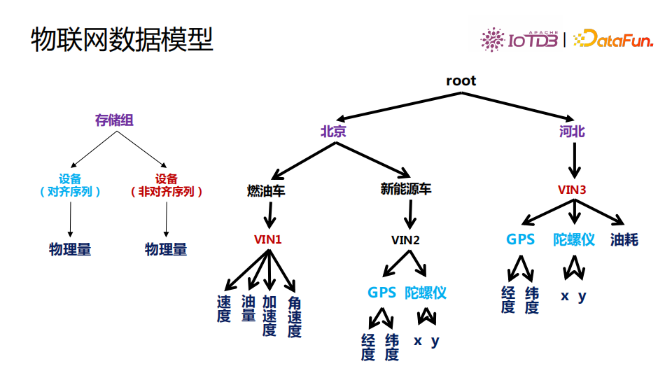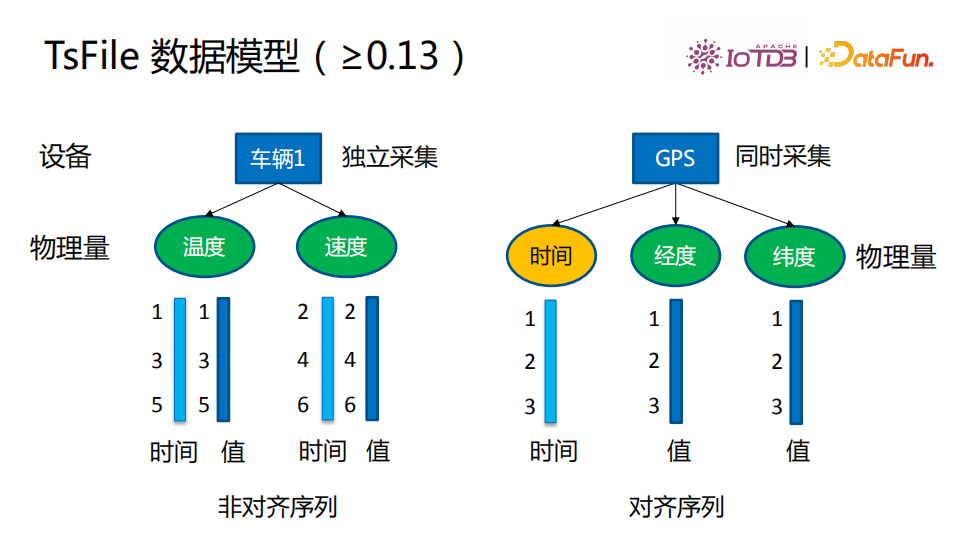 图中右侧这种设备GPS,有经度和纬度两个物理量,那这种数据一般都是同时采集的,会共享一列时间戳。这种方式两个列只存一列时间,我们称之为对齐序列。可以看到对齐还是不对齐应该是一个设备的属性,所以在设备层面有一个属性来做控制,在写入时也可以设置这个设备的属性。这个数据模型的特点是在0.13版本去引入的,3月会发布0.13版本。