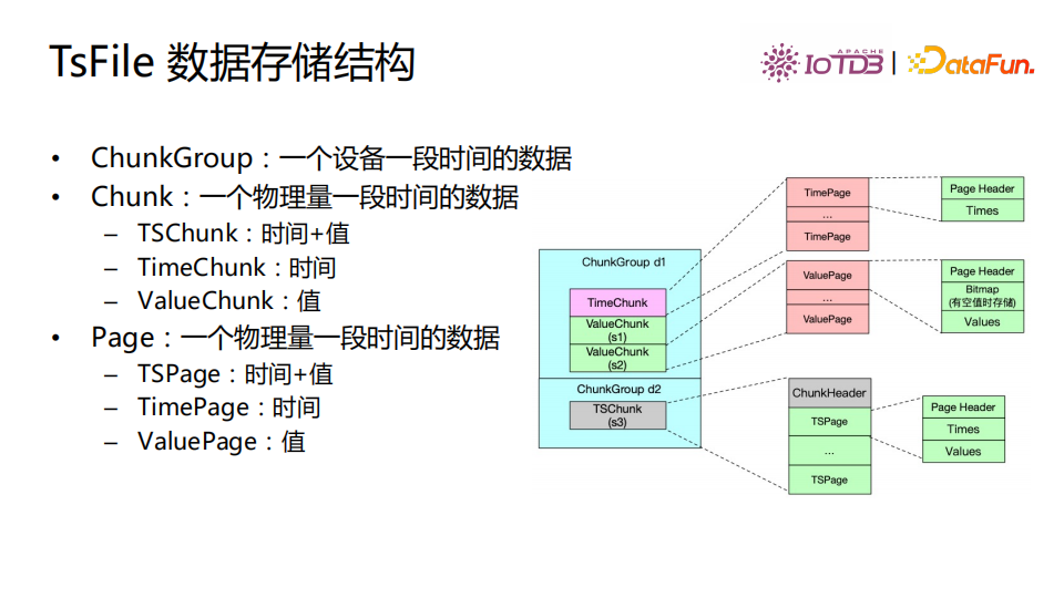 TsFile数据存储结构如图。ChunkGroups存储一个设备一段时间写入的数据。Chunk是一个物理量一段时间的数据,分为三种Chunk:(1)TSChunk,时间+值;(2)TimeChunk,时间;(3)ValueChunk,值。在Chunk基础上我们又把数据划分成Page,Page是一个物理量一段时间的数据,有三种Page:(1)TSPage,时间+值;(2)TimePage,时间;(3)ValuePage,值。通过这种方式,TsFile采用分级的数据存储结构进行管理。