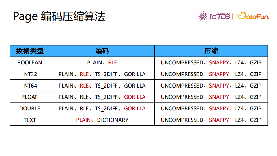 Page是数据最小粒度,可以对Page进行编码和压缩。图中展示了几种编码和压缩算法,红色的是数据类型的默认压缩编码与使用的算法。