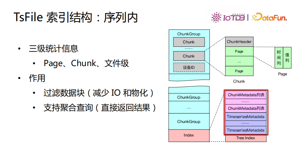 TsFile序列内索引是三级统计信息(Page、Chunk、文件级),作用是过滤数据块(减少 IO 和物化)和支持聚合查询(直接返回结果)。