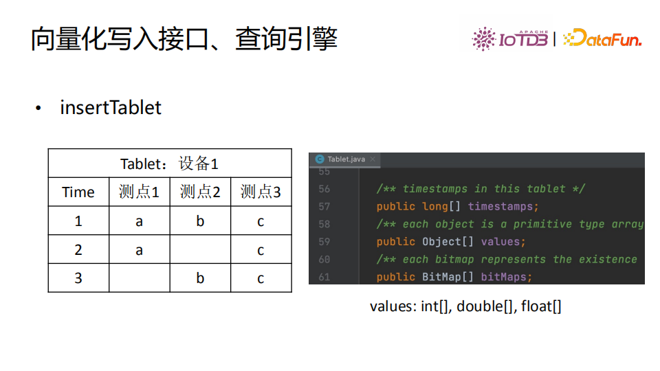 在向量化的写入接口和查询引擎方面,我们引用了一个Tablet的概念。Tablet结构就是管理了一个小的子表。下图中右侧是它的具体的数据定义方式,可以看到它是一个列式的存储,采用了一些原生数据类型的数组,没有封装更多对象。这个结构也保持了IoTDB的高效的读写性能。