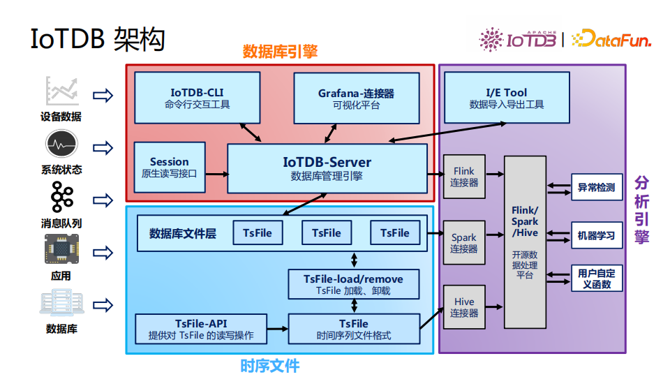 分析引擎方面,我们开发了各种对接开源数据处理平台的连接器,IoTDB 和底层的数据文件,都可以和分析引擎进行对接。