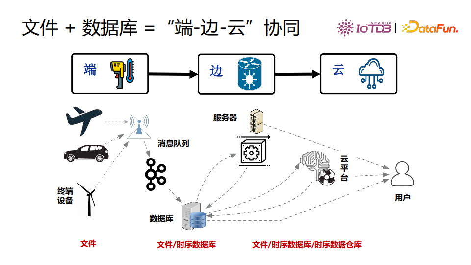 端侧应用的监控通常不需要非常及时,文件足够满足需求;端侧文件上传到边侧进行分析,也可以放到数据库中进行查询;云侧文件可以将文件对接Spark、Flink做数据分析,可以作为时序数据仓库使用。边侧和云测可以部署IoTDB数据库。