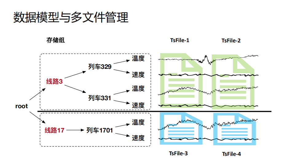 树形结构的数据模型与TsFile通过存储组进行连接。存储组可以让用户指定哪些序列可以存储到一个文件里,一个存储组一段时间的数据会形成一个TsFile。