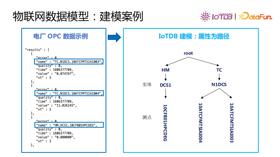 接下来我们看一些实际数据模型转化在IoTDB中建模的案例。图中是OPC Server采样的点位,这些点位是一个个Name,按点分割。这个结构和树形结构有天然的映射关系,我们可以在数据前面加一个root,按点进行树形模型拆解后构造成一棵树,映射非常自然。