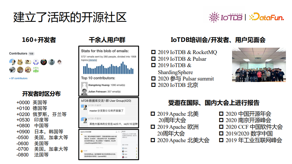 IoTDB社区目前有160多位开发者,上千人的用户群。IoTDB经常举办培训会和开发者、用户见面会。
