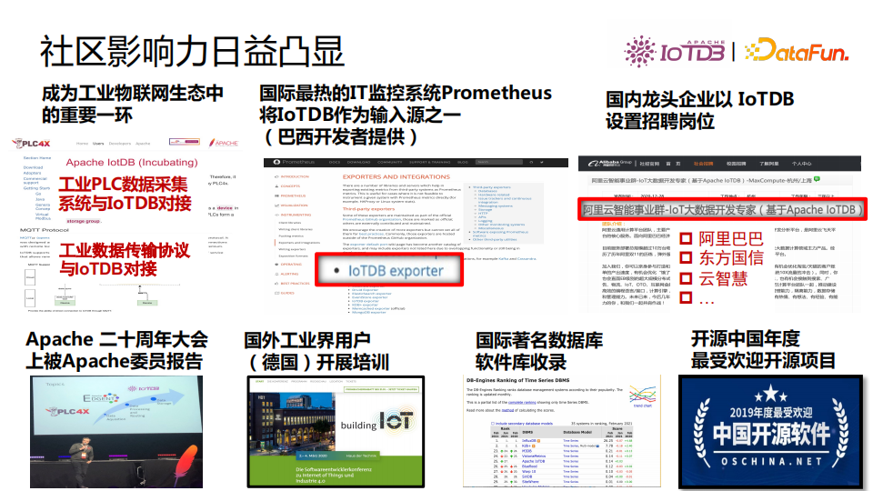社区在软件开发过程中的影响力逐渐增加,工业PLC数据采集系统已经与IoTDB进行了对接和集成,巴西的一些开发者贡献了IoTDB作为Prometheus的底层存储。国内龙头企业也设置了IoTDB相关的工作岗位。