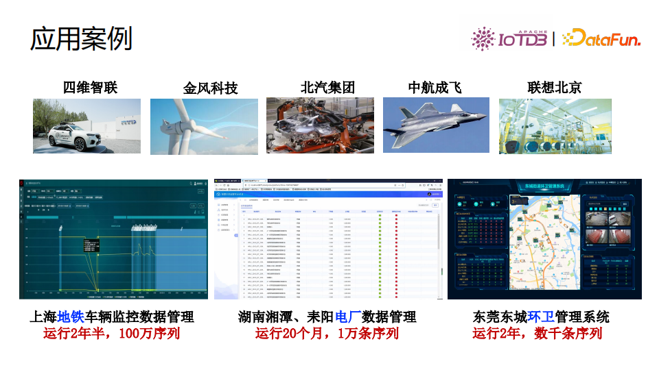 在应用方面:上海地铁运行了两年半,管理了100万时间序列数据。湖南湘潭和耒阳电厂数据管理系统应用IoTDB运行了20个月,管理1万条序列。东莞东城环卫管理系统中管理的各种环卫车的数据,运行两年多时间中管理着数千条序列。