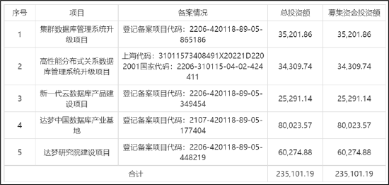 达梦数据此次发行上市拟募资23.51亿元,其中8亿元用于达梦中国数据库产业基地,6亿元用于达梦研究院建设项目,近7亿元用于存量项目升级,2.5亿元用于新一代数据库项目建设等。