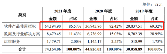 达梦数据的主营业务包括软件产品使用授权、数据及行业解决方案与运维服务三项,其中,软件产品使用授权业务是公司营收的主力军,最近一期收入占比将近九成。具体如下: