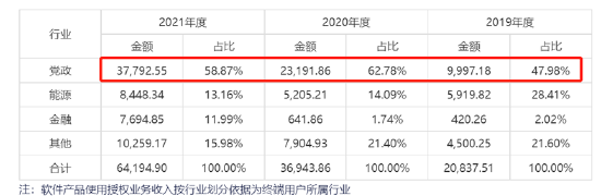 报告期内,公司软件产品使用授权业务终端用户主要集中于党政、能源和金融等领域。2019 年度、 2020 年度、 2021 年度,公司在该等领域实现的软件产品使用授权业务收入金额占比分别为 78.41%、 78.61%和 84.02%。报告期内,公司软件产品使用授权业务收入按终端用户所属行业领域分类情况如下: