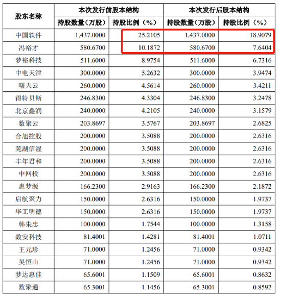 从股权结构看,公司实控人持股比例远低于第一大股东。招股书显示,公司实控人为冯裕才,但其直接持股比例为10.1872%,而第一大股东中国软件为25.2105%,持股比例远超实控人。