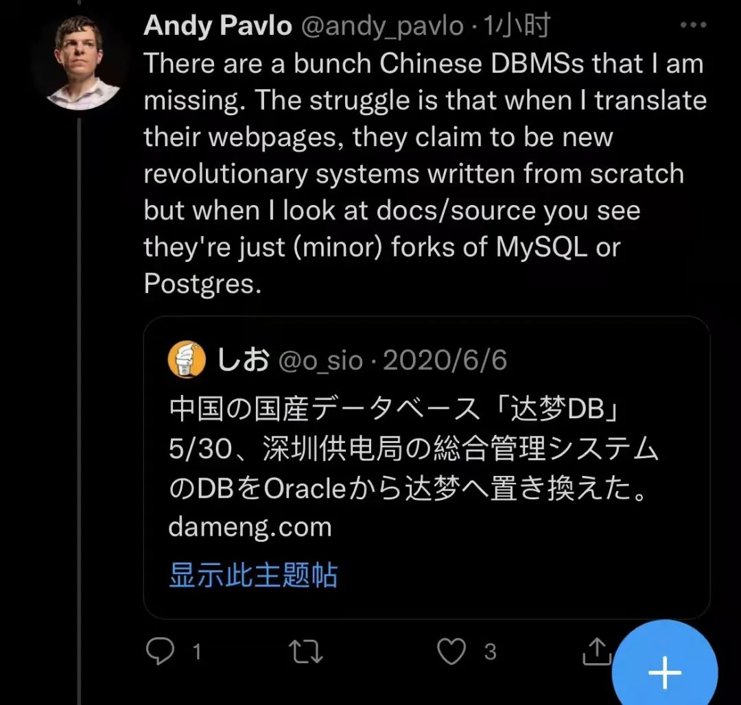 在他的 Twitter 上可以发现,他与 MySQL 界的一些大佬还是有些互动的,比如 Facebook 的 Mark, MySQL InnoDB 团队的大佬 Sunny 等人。那么 Andy 对我们中国的国产数据库有啥意见呢?Andy 说国产数据库号称是革命性(revolutionary),但当他从文档和源码研究后,发现国产数据库不过只是 MySQL 和 PostgreSQL 的分支版本而已。说到这里,姜老师就不开心了。然后就想在他的 Twitter 下留言:以上全错。