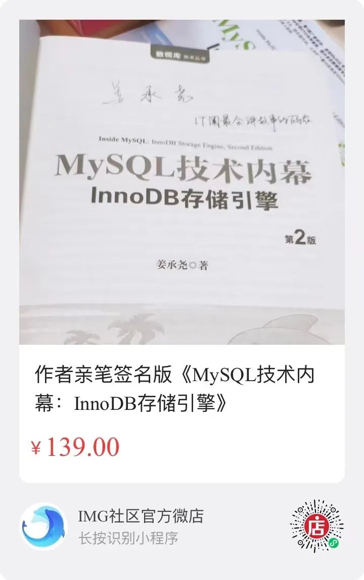 综上所述,未来划时代的数据库不一定非得是 MySQL 的分支版本,也不一定非得是分布式数据库的形态,但它必将诞生在中国。BTW,想要购买姜老师《MySQL技术内幕:InnoDB存储引擎》签名版的,可扫下方二维码: