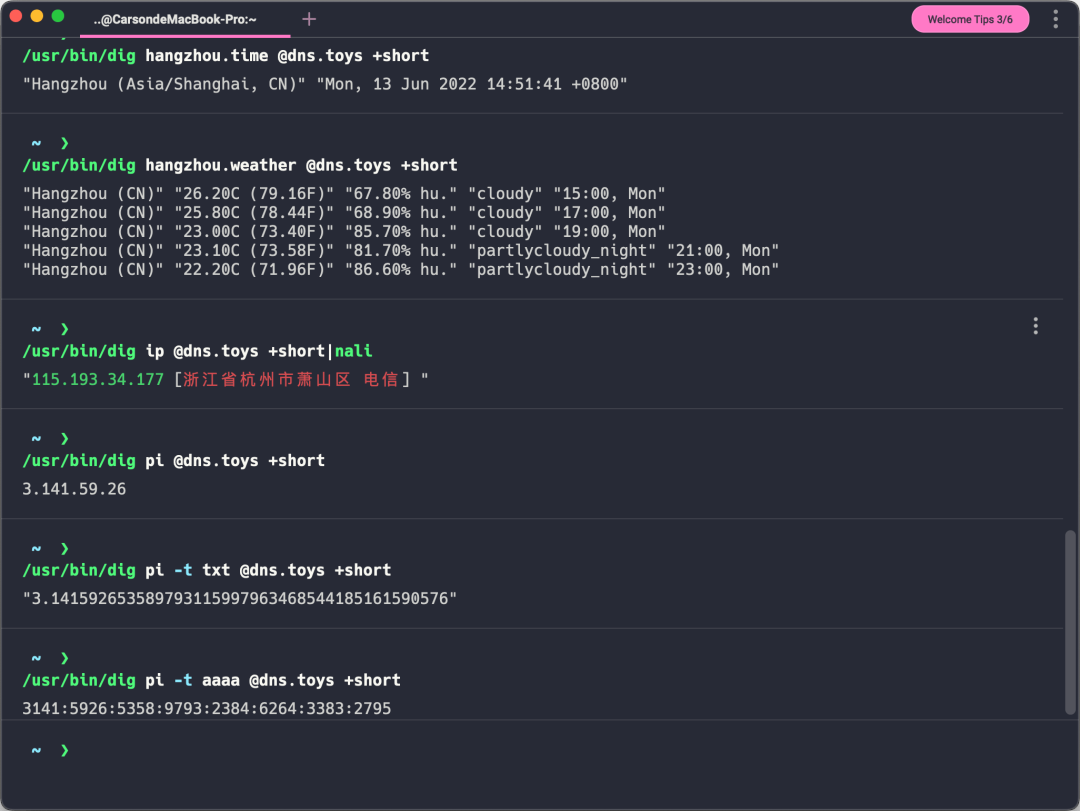 dns.toys 是一个比较有创意的 DNS 服务器,它利用 DNS 协议提供了很多非常有趣的功能和服务。例如查询时间、天气、圆周率、单位换算等等。